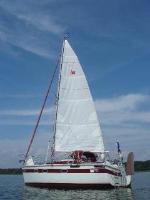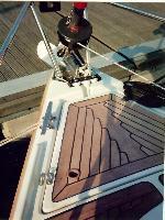 Durchgelattetes Großsegel mit Harken-Kugelrutschern, selbst- holende Harken-Genuawinschen, Bugkorb mit Durchstieg und Seereling doppelzügig 60 cm hoch, Edelstahl-Pflugschar- Anker, Fenderhalter am Heck- korb, Logge und Lot